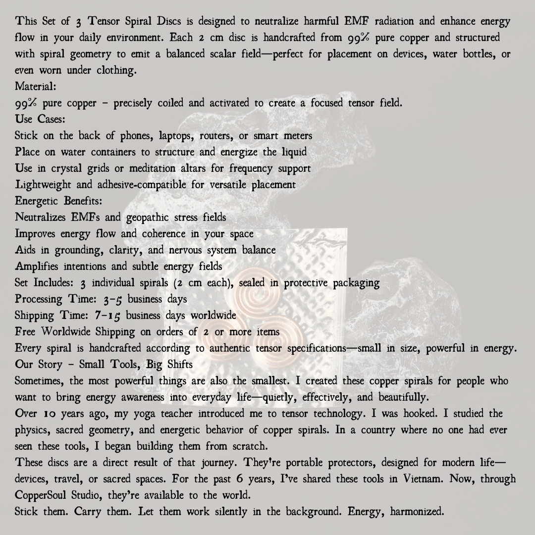 Material & Design: Handcrafted from 99% pure copper, each spiral disc is structured with sacred geometry to emit a balanced scalar field that neutralizes EMFs and enhances energy flow. Lightweight and adhesive-compatible, they are designed for versatile placement and everyday use.
